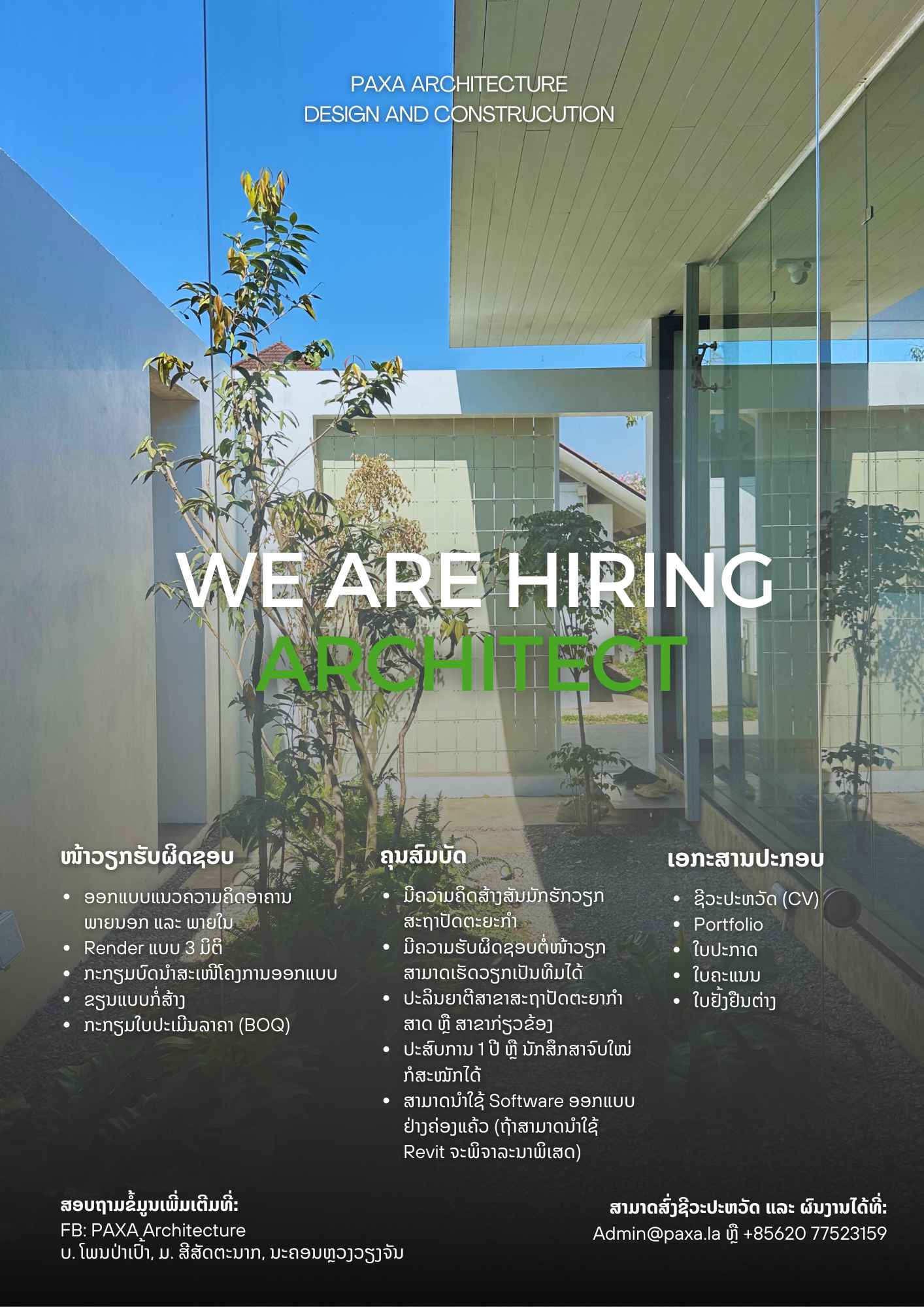 ເປີດຮັບສະໝັກ ສະຖາປະນິກ 1 ຕຳແໜ່ງໜ້າວຽກຮັບຜິດຊອບ:
