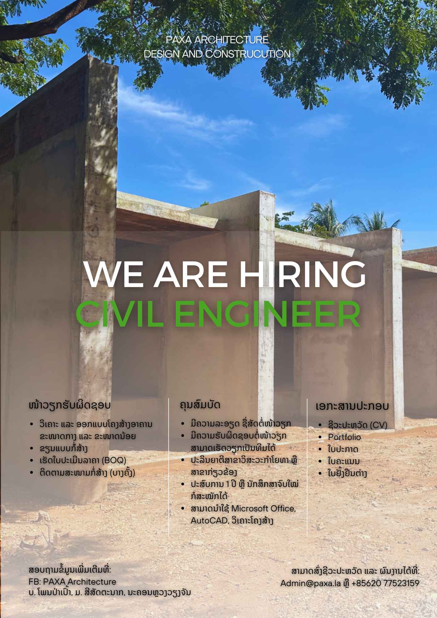 ເປີດຮັບສະໝັກ ວິສະວະກອນໂຍທາ 1 ຕຳແໜ່ງໜ້າວຽກຮັບຜິດຊອບ: